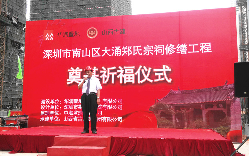 在这春和景明的美好时节,我们欢聚在大涌郑氏宗祠的殿堂前,有幸与各位郑氏宗亲、各位来宾,共同隆重举行郑氏宗祠修缮工程奠基祈福仪式,倍感荣耀。这不仅是深圳市文化建设事业的大事,也是海内外的所有郑氏宗亲的共同企盼、共同祝贺的大事。借此机会,我谨代表施工单位山西省古建筑集团有限公司,对本项修复修缮工程的奠基表示热烈祝贺!对参加大会的各级领导和各位来宾表示崇高的敬意。